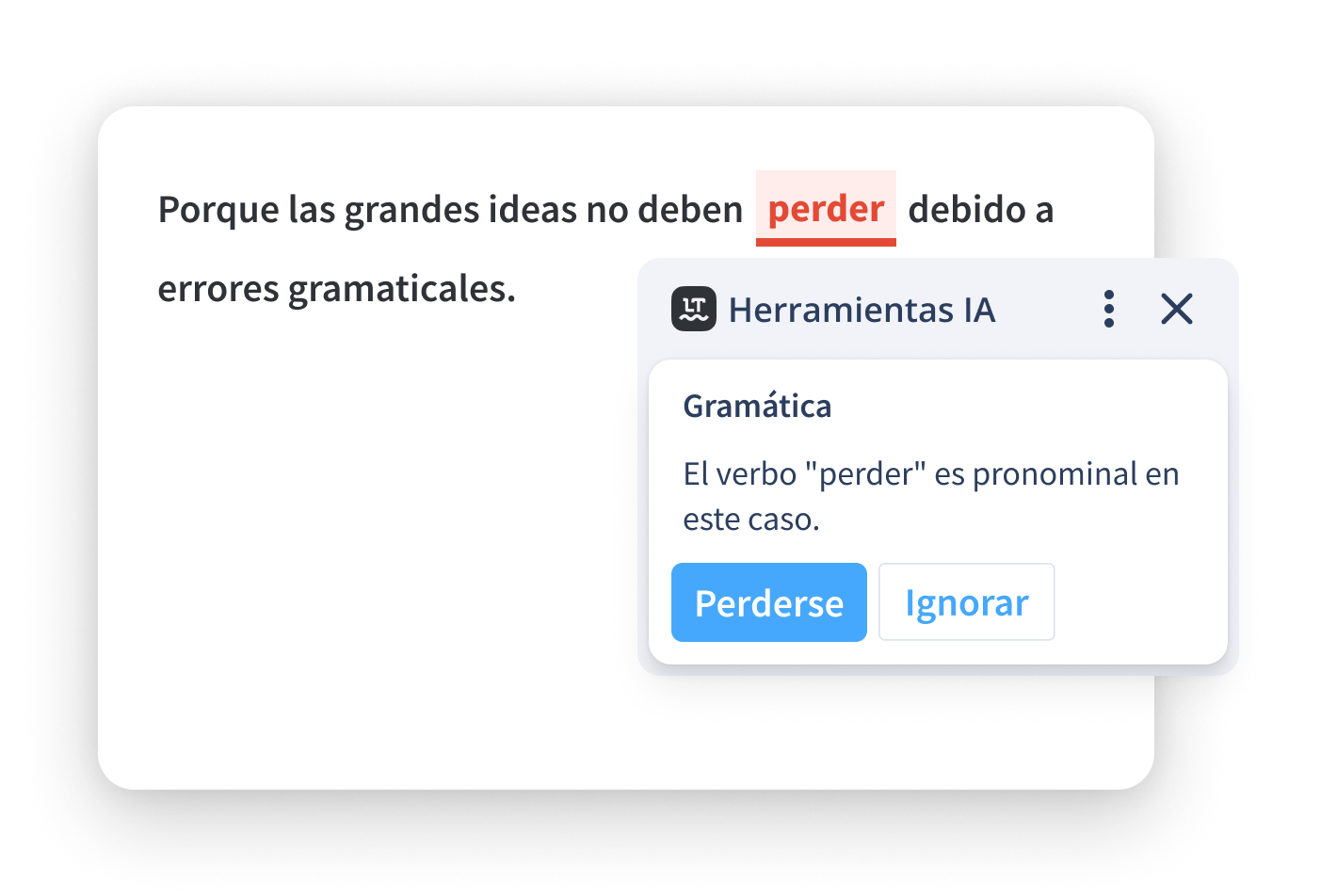 Usa nuestro corrector ortográfico más avanzado que emplea inteligencia artificial para solucionar rápidamente problemas de concordancia, elección de palabras y el uso de tildes o comas.