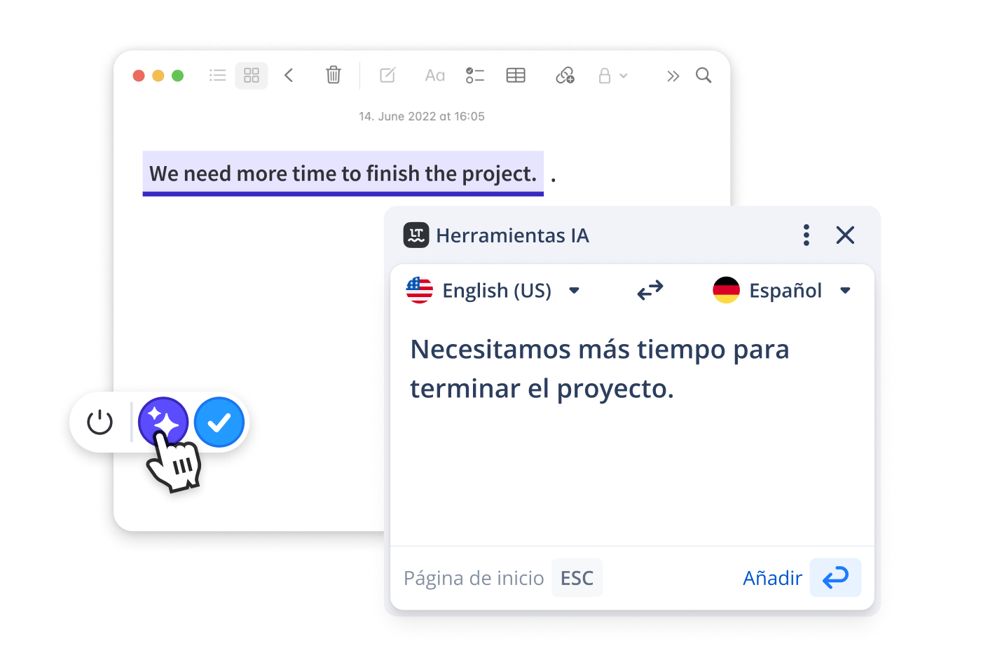 Traduce de forma fácil y fluida entre más de 10 idiomas. Elimina la necesidad de copiar y pegar tu texto entre diferentes campos de texto.
